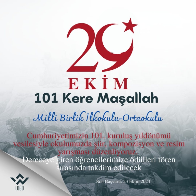 Cumhuriyetimizin 101. kuruluş yıldönümü vesilesiyle okulumuzda şiir, kompozisyon ve resim yarışması düzenliyoruz.Dereceye giren öğrencilerimize ödülleri tören sırasında takdim edilecektir.