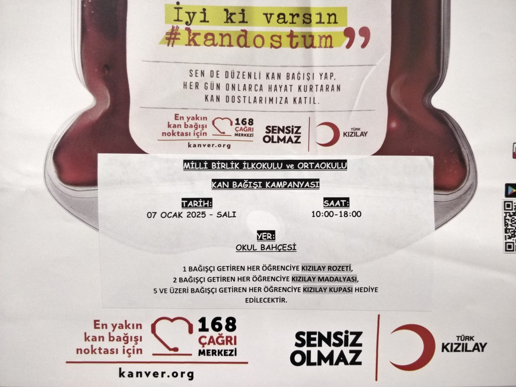 07.01.2025 tarihinde okul bahçesinde "KAN BAĞIŞI KAMPANYASI" düzenlenecektir. Tüm velilerimizi ve mahallelileri kan bağışına bekliyoruz.